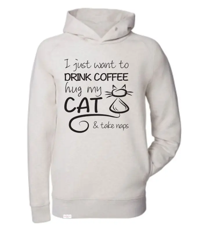 Superskön hoodie med klassisk passform (unisex); borstad fleece på insidan, ribbade muddar och fickor vid sidosömmen. Klassisk ljusgrå färg med svart tryck, från vår alldeles egna lilla kollektion med tröjor, alla tryckta med det fina kattmotivet som Jenni har ritat och designat; "I just want to drink coffee, hug my cat and take naps".