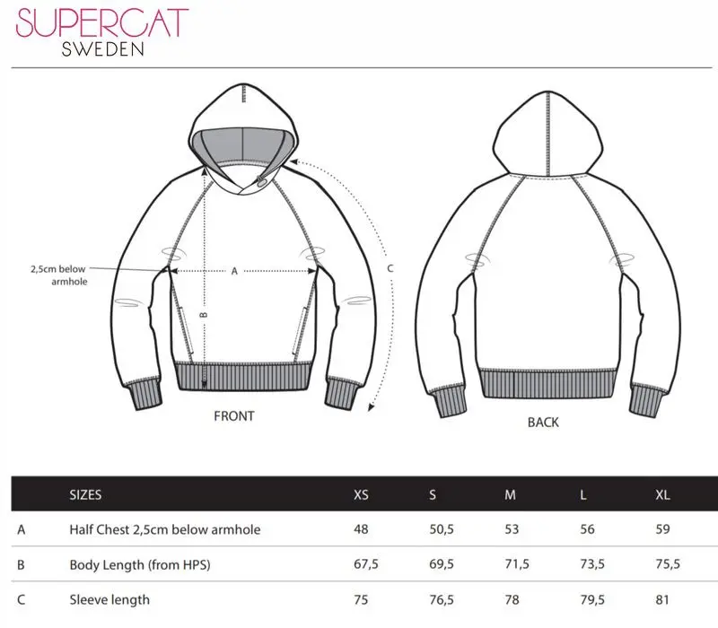 Superhärlig modell på hoodien med lite längd på tröjan samt även bra längd på ärmarna, så den blir inte för kort om man själv är lite lång. Mät gärna upp din storlek med hjälp av måtten på produktbilden, så att vi kan minimera antalet returer pga fel storlek.