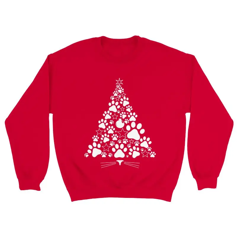 En snygg klarröd jultröja med motiv i vitt, en julgran uppbyggd av tassar. Tröjan är sydd i en ledig unisexmodell med classic fit som är skön både på julfesten och som myströja. Den perfekta jultröjan till en kattälskare.