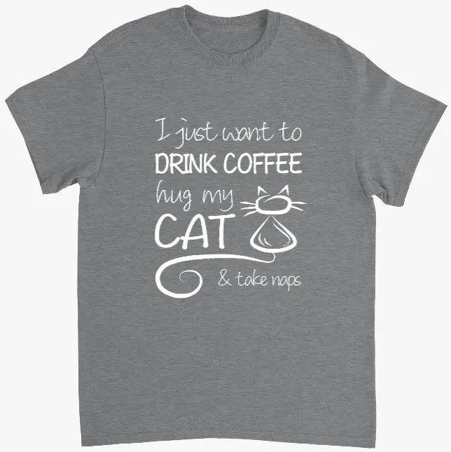 Nu är en av våra favoriter i lager igen; t-shirten med trycket "I just want to drink coffee, hug my cat & take naps". En perfekt unna-mig-grej till dig själv eller en present till någon av dina kattvänner! Den här klassiskt grå T-shirten har tryck på framsidan och är helt ren på baksidan.