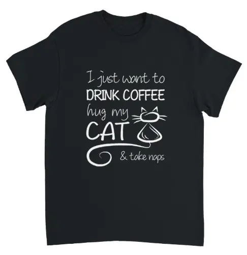 Nu är den snygga t-shirten med trycket "I just want to drink coffee, hug my cat & take naps" äntligen tillbaka. En finfin present till någon av dina kattvänner, eller något att unna dig själv! T-shirten har tryck på framsidan och är helt svart på baksidan.