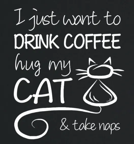 Nu är den snygga t-shirten med trycket "I just want to drink coffee, hug my cat & take naps" äntligen tillbaka. En finfin present till någon av dina kattvänner, eller något att unna dig själv! T-shirten har tryck på framsidan och är helt svart på baksidan.