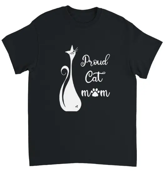Den här stilrena t-shirten med trycket "Proud Cat mom" är en fin present till en kattmamma du känner. Den är enkel och snygg, passar lika bra på jobbet som på fest.