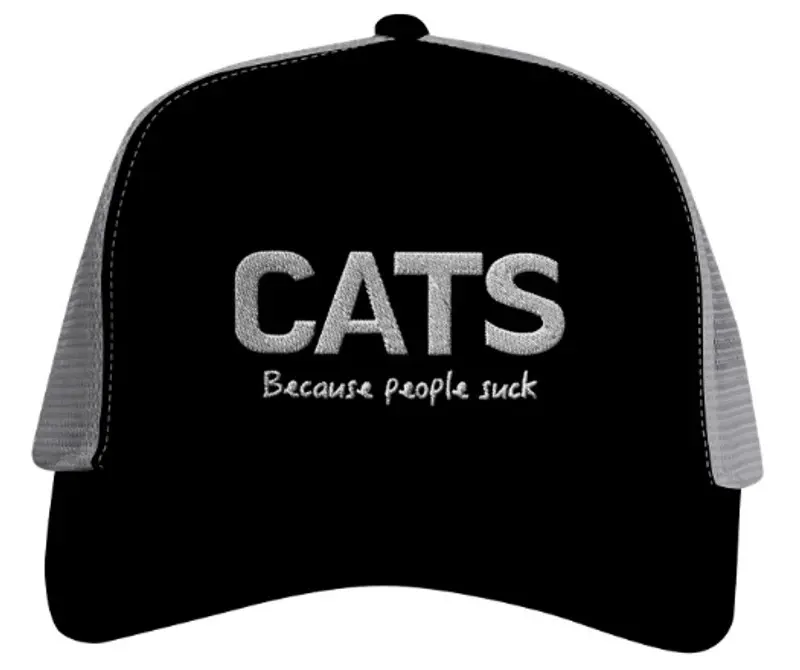 Den här coola truckerkepsen med texten "CATS, because people suck" är en rolig present till en kattälskare. Eller till dig själv om du vill göra ett statement på arbetsplatsen.