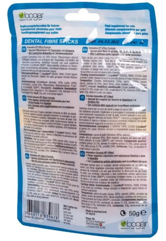 Bogadent Dental Fibre Sticks Fish är ett smart sätt att kombinera daglig tandvård med en god belöning för din katt. Med 86% lax och schweizisk kyckling och den innovativa XF5-Effect-formulan (växtfibrer, naturliga enzymer, tranbär och mineraler) bidrar sticksen till att minska tandstensuppbyggnad och stödja ett friskt tandkött.