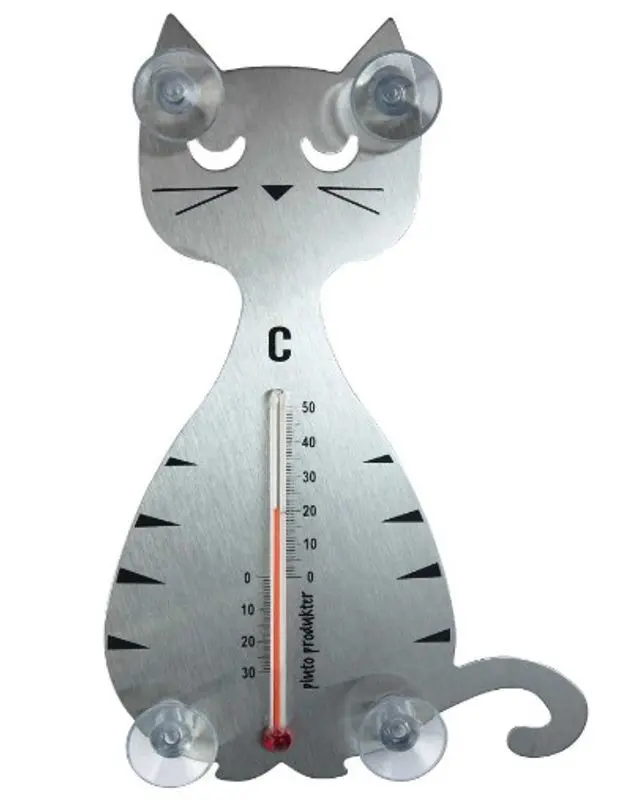 Härlig termometer med fint silvrigt kattmotiv från märket Pluto Produkter. Den fästs på fönsterrutan med sugpropparna som sitter på tassar & öron och visar dig temperaturen utanför fönstret.
