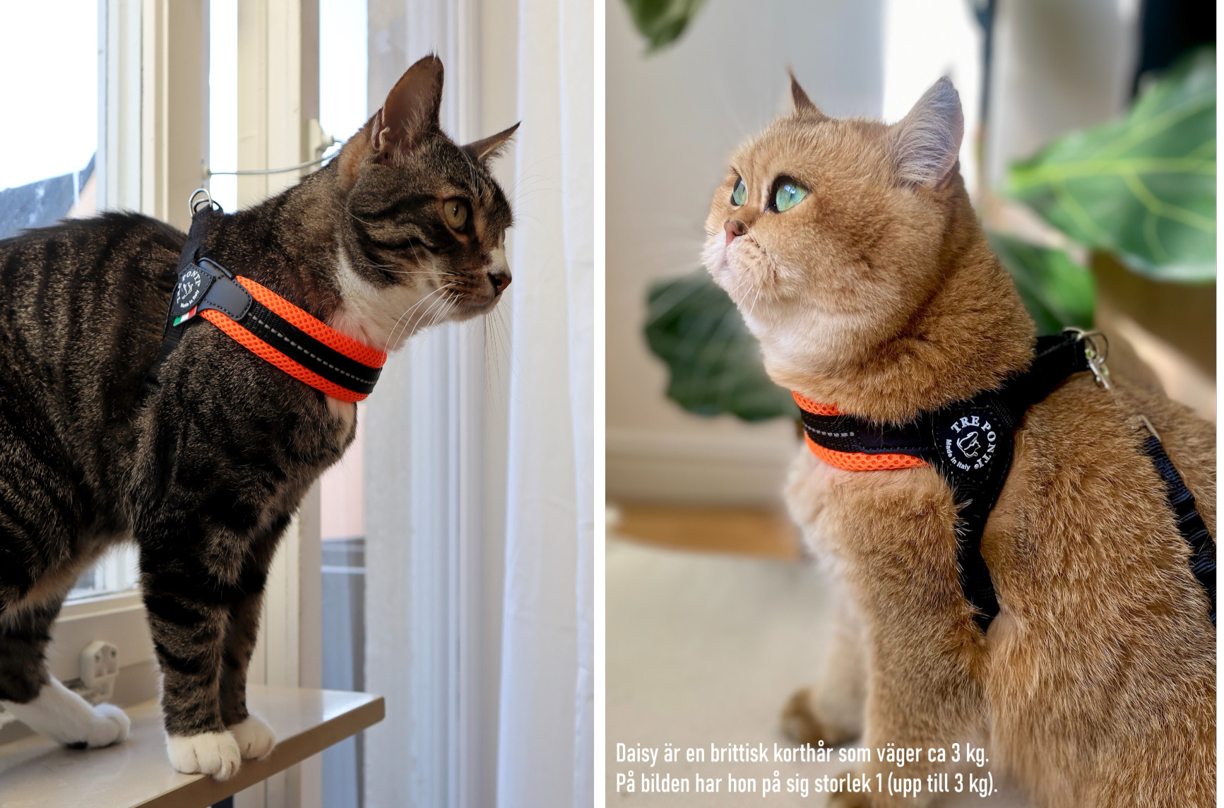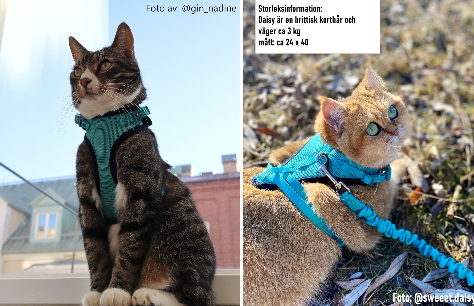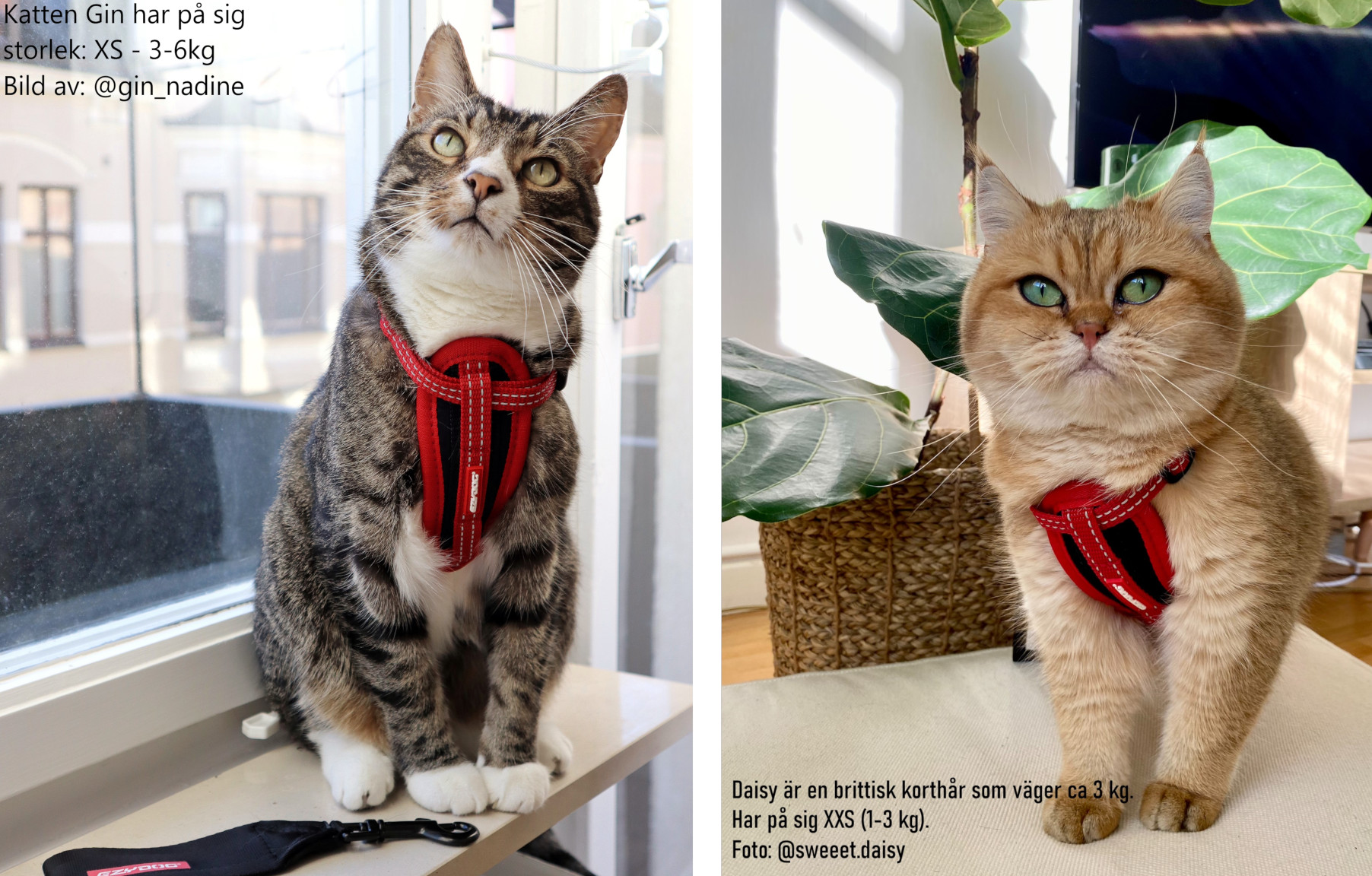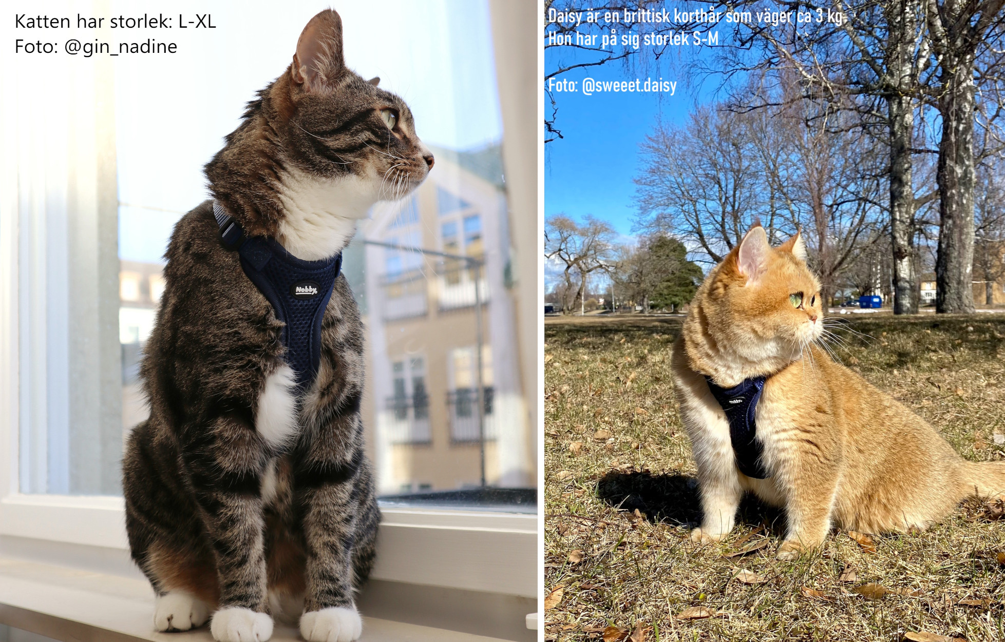 Här har vi samma sele fast på olika katter och olika storlekar. Läs nedan för att se vad katternas ägare tyckte om selarna: