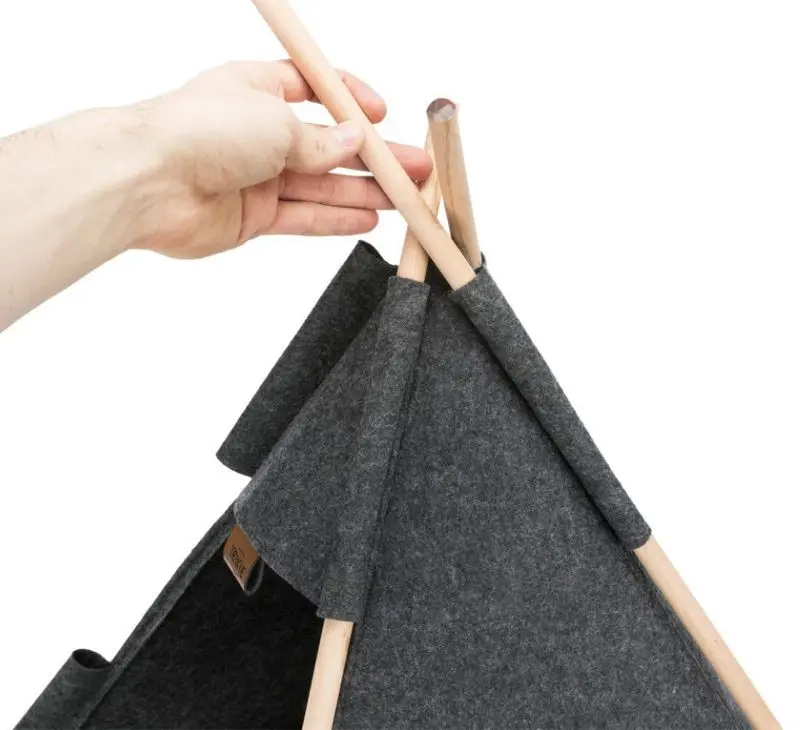 Tipin är ihopfällningsbar och går att förvara platsbesparande. Tältet är tillverkad i filt (polyester) och dynan har ett överdrag av långhårig plysch samt en fyllning av polyseter-fleece.