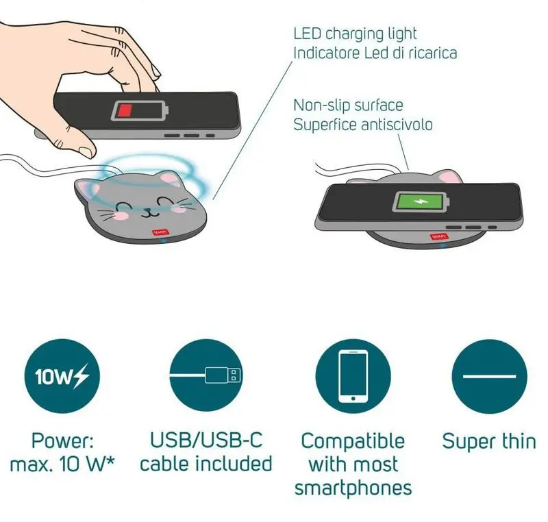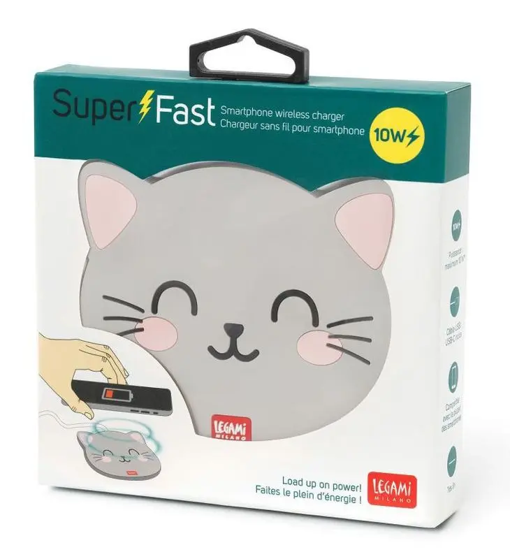 Vem har sagt att en laddare inte kan vara söt? Den här trådlösa laddningsplattan från Legami har formen att ett katthuvud och är både söt som socker och samtidigt praktisk. Du ansluter laddplattan till en strömkälla, med hjälp av med den medföljande usb-kabeln. Sedan kan du lägga en smartphone (som är Qi-kompatibel) direkt på laddaren, och ladda trådlöst.