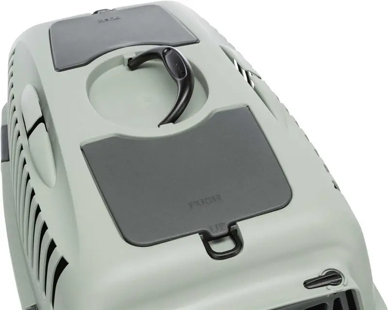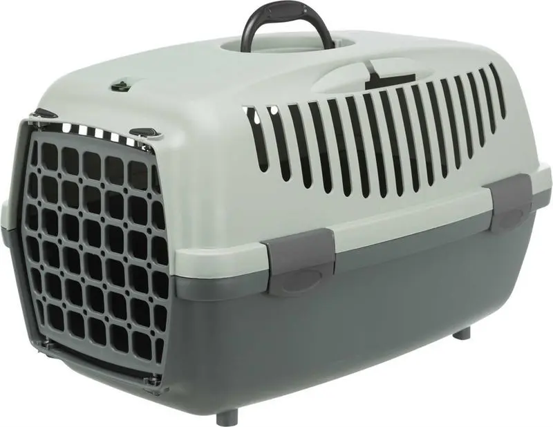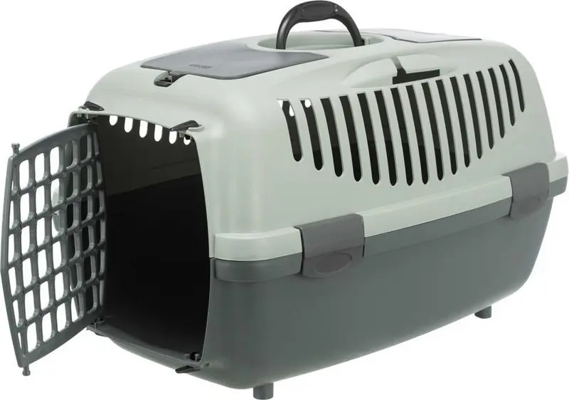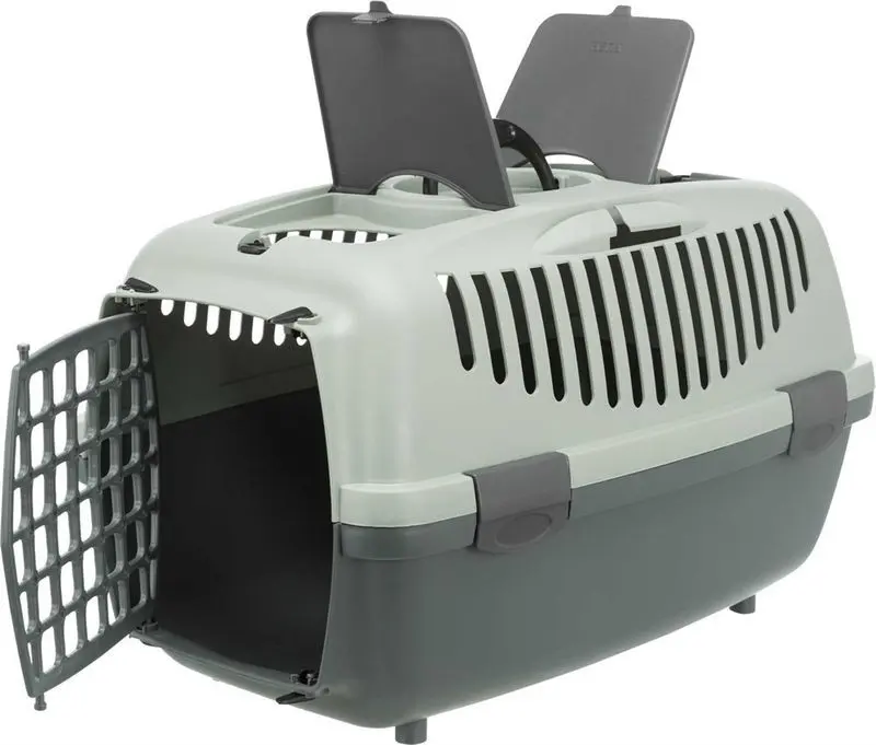 Transportbur för katt tillverkad i hårdplast. Transportburen har en bra storlek, bärhandtag upptill, det finns hållare för säkerhetsbälte vid bilåkning, förvaringsficka och liten taklucka.