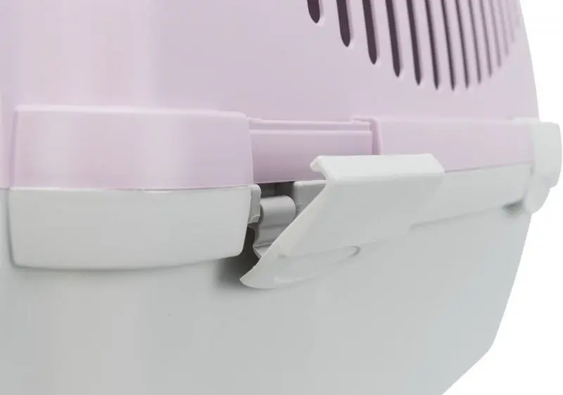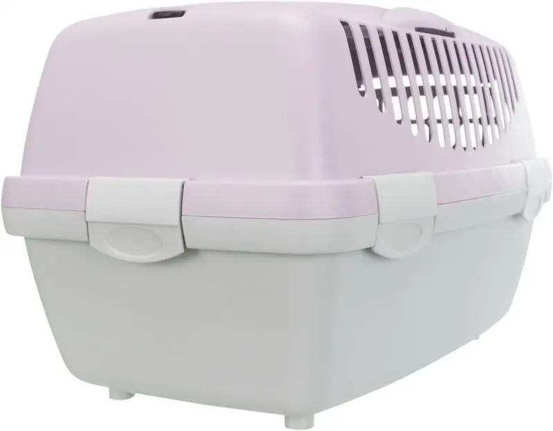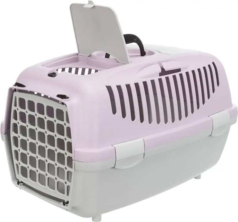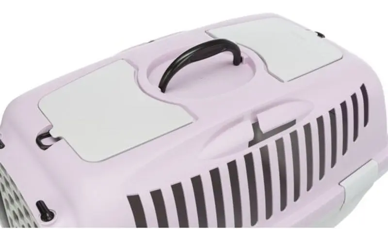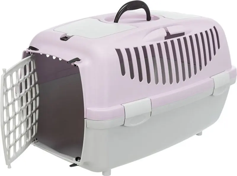 Transportbur för katt tillverkad i hårdplast. Transportburen har en bra storlek, bärhandtag upptill, hållare för säkerhetsbälte vid bilåkning, förvaringsficka och liten taklucka.