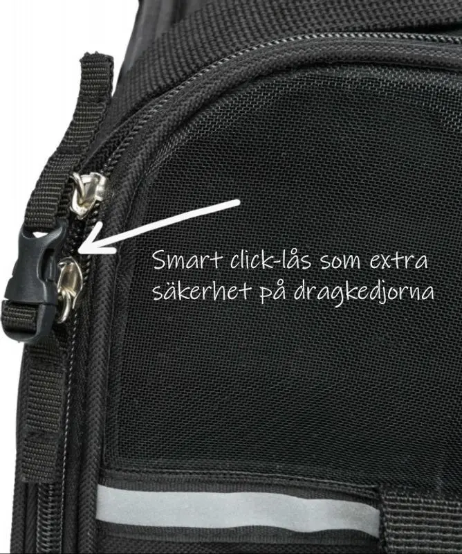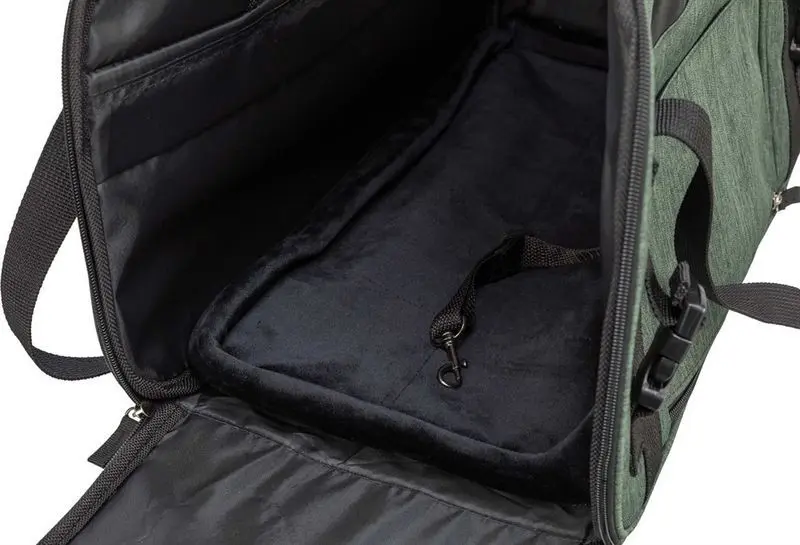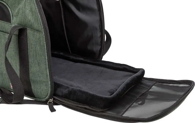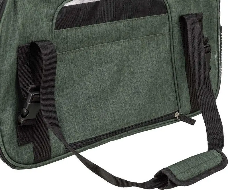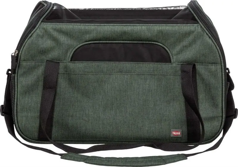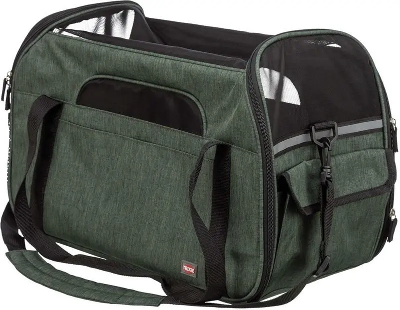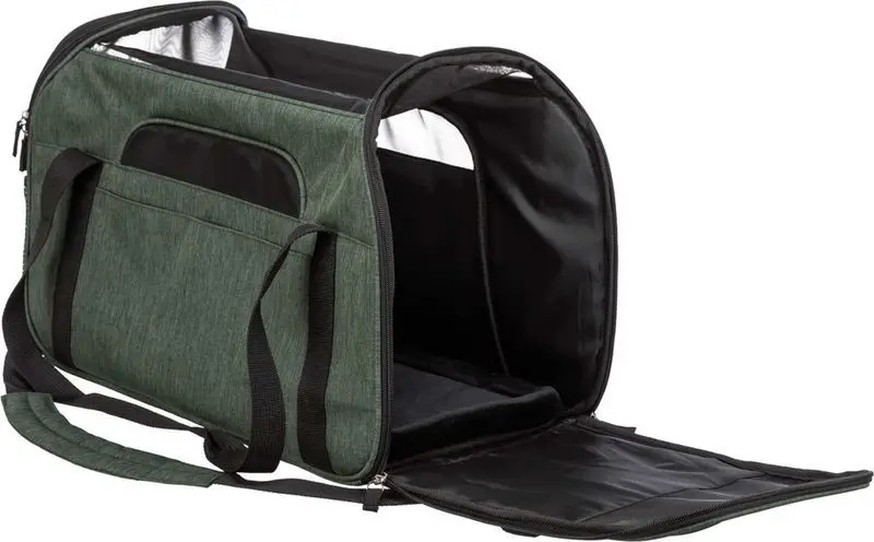 Madison är en mjuk och populär transportväska för katter eller små hundar, en transportväska med extra fiffiga klick-lås på dragkedjorna som gör att pillriga tassar inte kan öppna dragkedjan inifrån. Mörkgrön och svart färg.