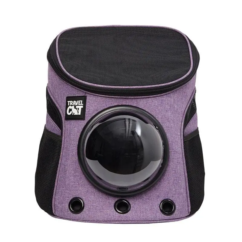 Fat Cat Mini från Travel Cat är en stabil ryggsäck för den mindre katten eller för din kattunge. Den här lila ryggsäcken har en stadig botten, stadiga sidor och bra ventilation. Hela locket är av kraftig mesh, det finns mesh på sidorna samt extra lufthål i främre nederkanten. Mitt på framsidan finns ett runt mesh-fönster, som går att byta ut mot den populära bubblan i hårdplast, ett fönster som gör det enklare för katten att se vad som pågår där ute.