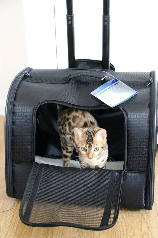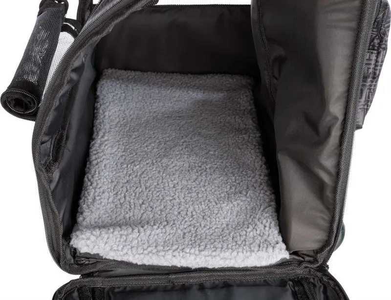 Nylonväskan kan öppnas framtill och har fickor på sidan av väskan för kattens saker (godis, koppel, stamtavla etc).