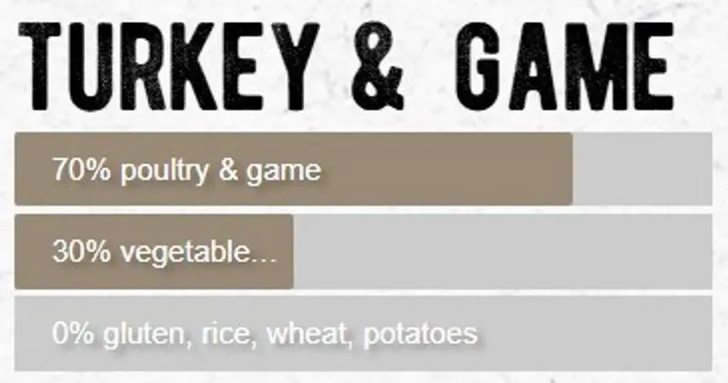 Poultry and game 70% (thereof 25% poultry meat meal, 16% fresh turkey, 15 % fresh game, 7% turkey meat meal, 7% poultry fat), peas, sweet potato, linseed, fled seed coat, apple, carrot, spinach, cranberry, knotted wrack, peppermint, parsley, rosemary, stinging nettle leaves, chamomille, sage, thyme, choriander leaves, dandelion leaves, sweetheart root (Glycyrriza glabra), fructooligosaccarides, yucca schidigera.