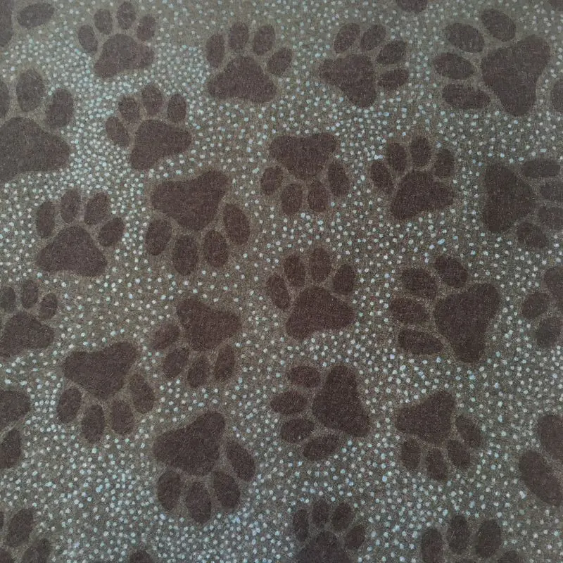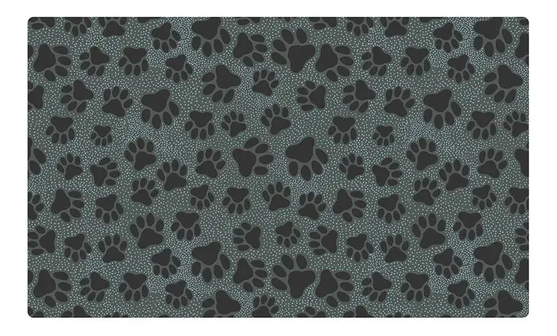Ett absorberande underlägg från märket Drymate med grå-svart färgskala och motiv av flera tassar. Underlägget passar bra till matskålar och speciellt bra är det att ha under vattenskålar och vattenfontäner.