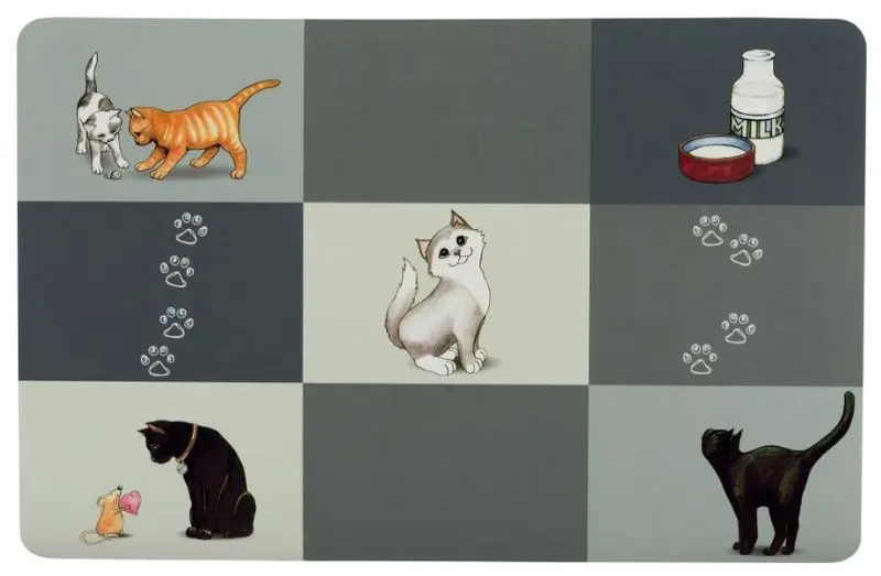 Fint underlägg till din kattmatskål eller vattenskål. Mönstrat som ett lapptäcke, ett "patchwork", 4 söta motiv samt tassavtryck.