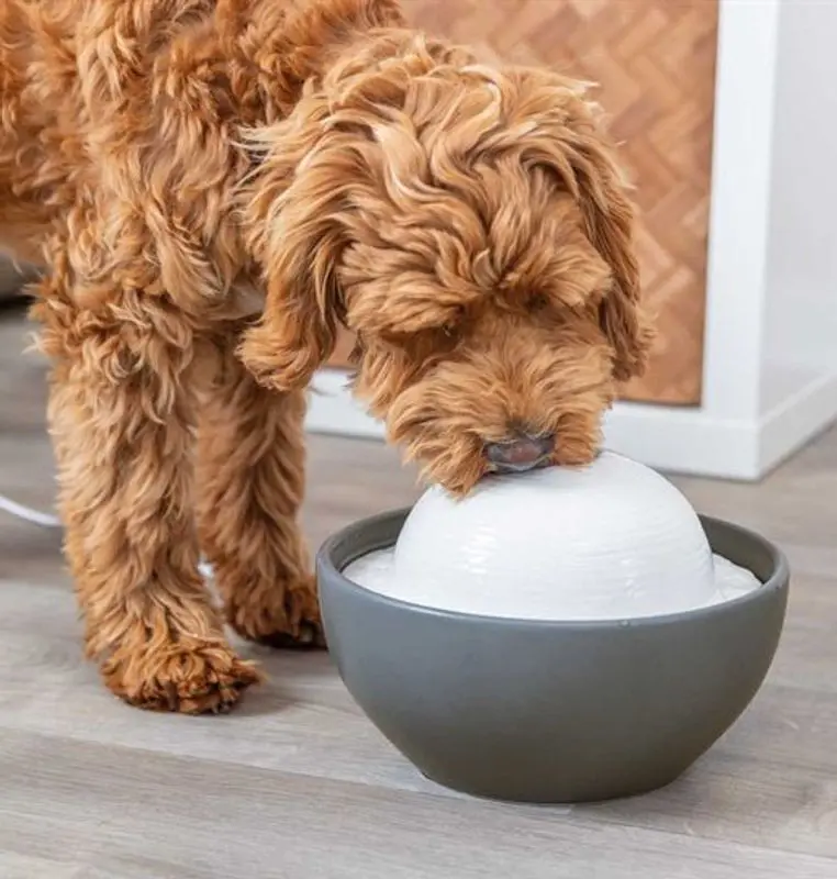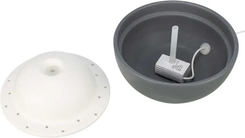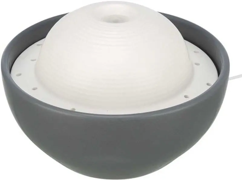 Den nya vattenfontänen Vital Dome från Trixie är tillverkad i keramik. Den består av en grå skål och en vit topp, och passar fint in i det moderna hemmet.