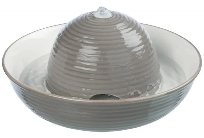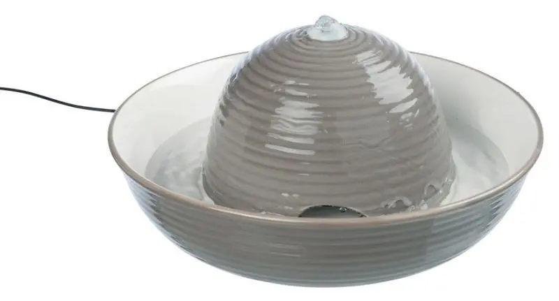Vattenfontän Vital Flow i en snygg grå färg (med vit insida) från märket Trixie, tillverkad i keramik. Vital Flow är designad för katter och hundar som undviker stillastående vatten och helt vill dricka ur kranens stråle. Detta är en kvarliggande instinkt hos många djur då stillastående vatten i naturen inte alltid är tjänligt som dricksvatten. Djur söker sig helst till strömmande vatten från t ex bäckar och inomhus till en vattenkran.